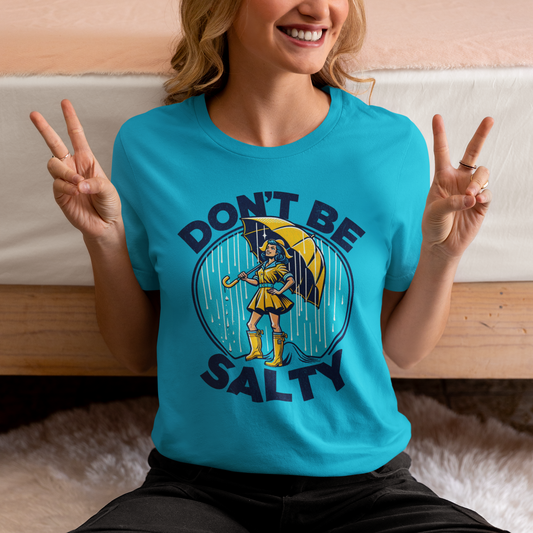 Don't Be Salty: Classic Morton's Salt Girl with Yellow Umbrella on Bella Canvas 3001 Unisex Short Jersey Tee Extended sizes available