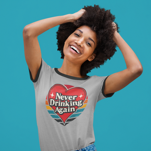 Sunday Brunch Essential: 'Never Drinking Again' Ringer T-Shirt with Retro Typography in 3 Colors