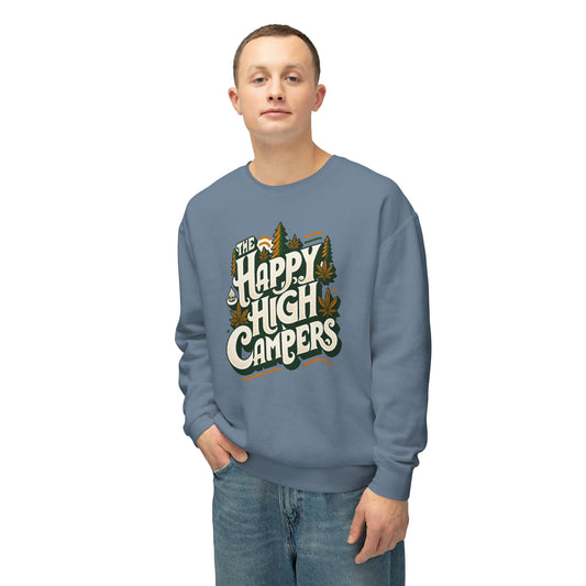 Happy High Campers Crewneck Sweatshirt: Retro Cannabis Camping Vibes Comfort Colors 1466 Unisex Lightweight Crewneck Sweatshirt - 6 Retro Colors!