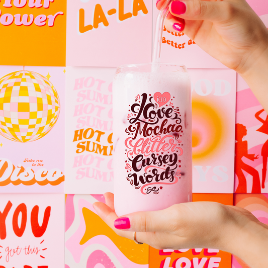 Exclusive Design 16 oz Glass Cup with Iced Mocha Love, Glitter Glam, and a Dash of Sassy Charm!