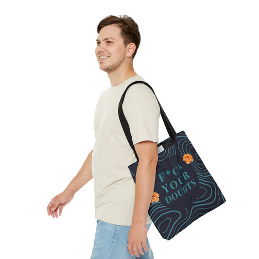 Crafting a respectful alternative with a similar sentiment: "Challenge Your Doubts" Tote Bag