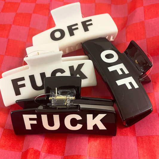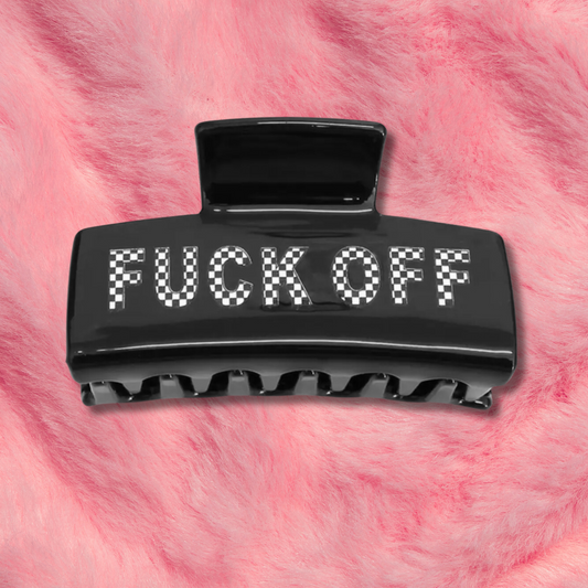 Acrylic Checker 'FUCK OFF' Print Hair Claw - 3.1'' Wide with a Black Velvet Moon & Stars Jewelry Drawstring Gift Bag