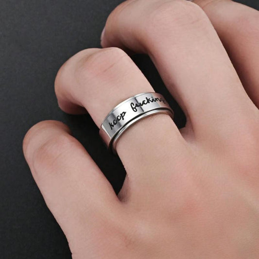 Keep Fucking Going Spinner Ring | Silver & Black Stainless Steel Anxiety Ring Includes a Novel Ring Gift Box