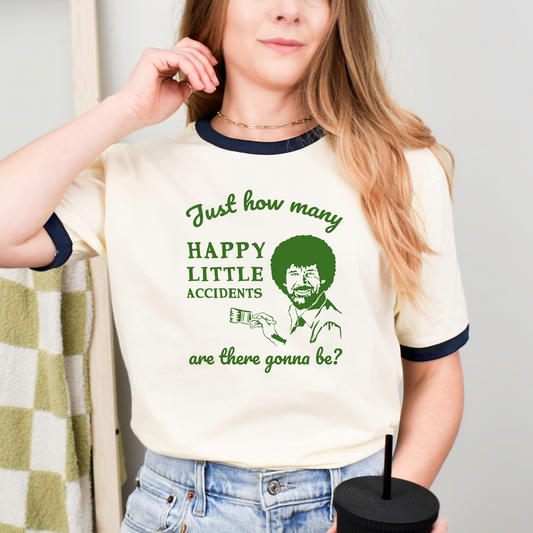 Bob Ross Happy Accident Inspired Next Level Ringer Unisex Cotton Tee in 3 Classic Colors