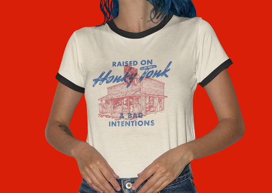 Raised on Honky Tonk & Bad Intentions Ringer T-Shirt - Retro Country Style Tee, Vintage Graphic Tee, Unisex Graphic Tee, Music Lover Gift